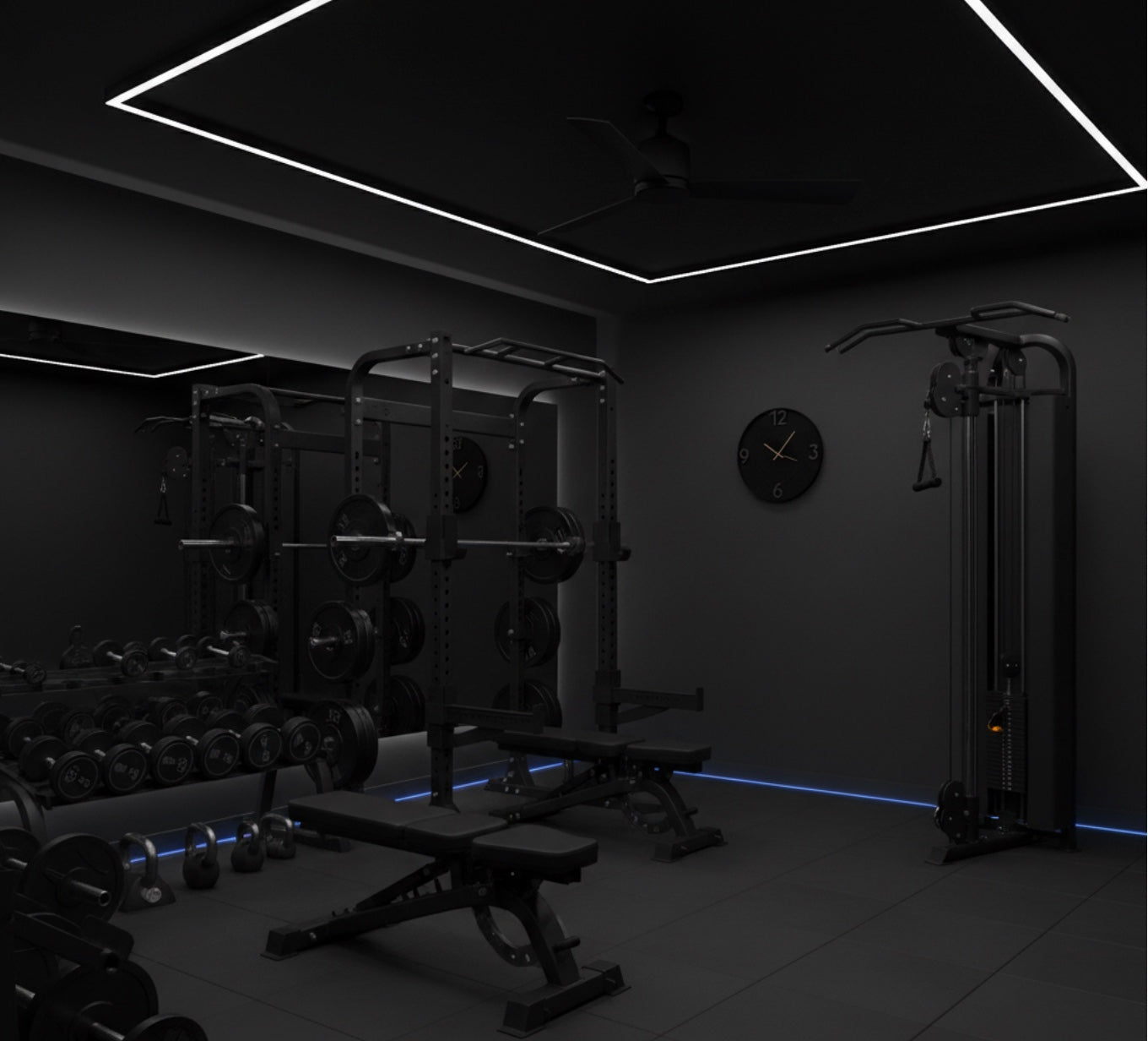 - Dumbbell racks create a clean, pro look.